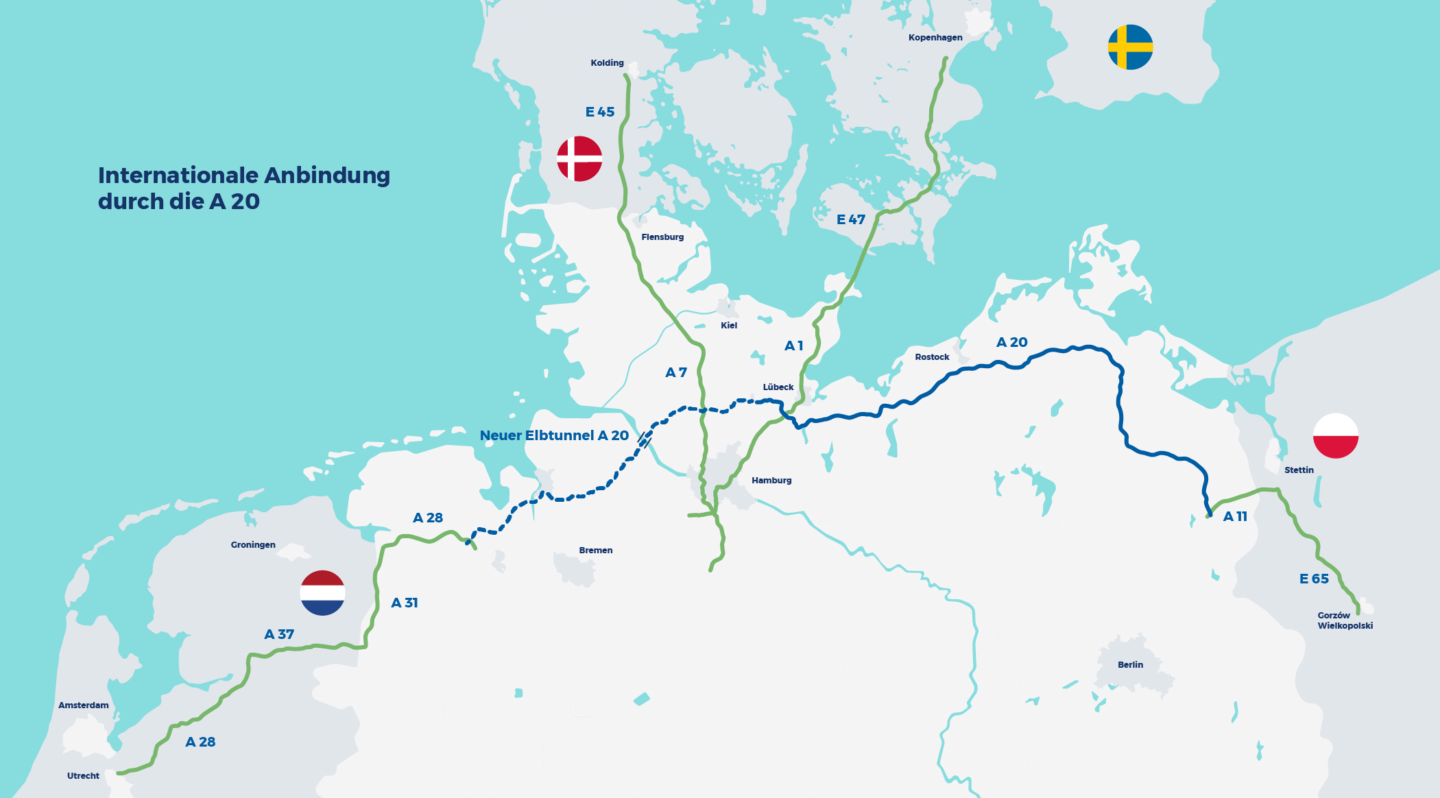 Als Teil des europäischen Autobahnnetzes trägt die A 20 zusätzlich dazu bei, den gemeinsamen Wirtschaftsraum zu stärken und fördert den grenzüberschreitenden Austausch zwischen den Anrainerstaaten der Ostsee und den Wirtschaftszentren an der Nordsee. Das macht sie zu einem wichtigen und zentralen Baustein für die zukünftige Entwicklung von Wirtschaft und Verkehr in Norddeutschland und Europa.